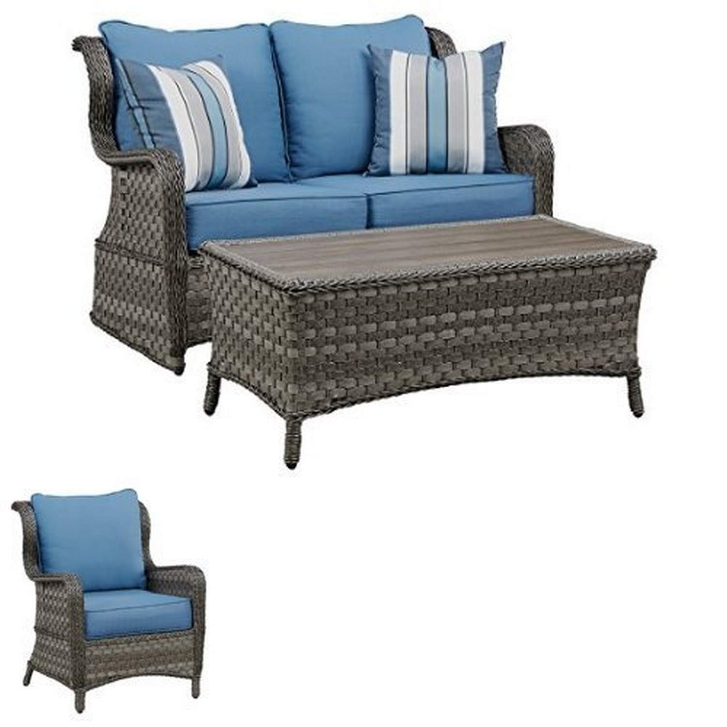 Ashley Furniture Signature Design - Abbots Court 4-Piece Outdoor Set - Loveseat Glider with 2 Pillows Coffee Table 2 Lounge Chairs with Cushions - Blue Gray 50 out of 5 stars 1. On the cocktail tabletop planked wood-look resin is richy grained and shaded like driftwood. Durable high performance Nuvella fabric.