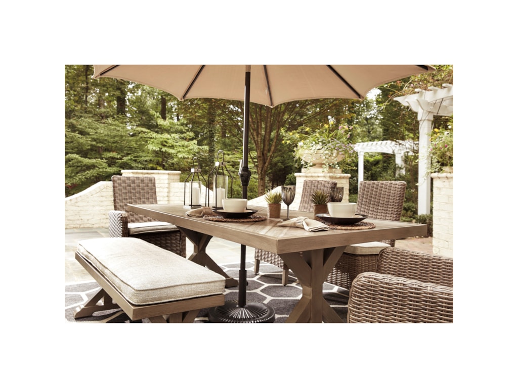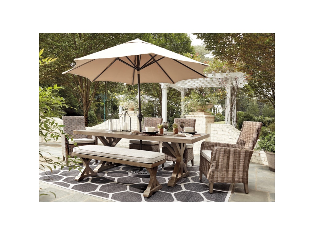 Sporting an easy-on-the-eyes look inspired by driftwood the Beachcroft 5-piece outdoor furniture set elevates the art of indoor-outdoor living. Sporting an easy-on-the-eyes look inspired by driftwood the Beachcroft Dining Set elevates the art of indoor-outdoor living. Beachcroft Signature Design by Ashley Beige 6-Piece Outdoor Seating Set 143W x 11875D x 365H 372lbs.