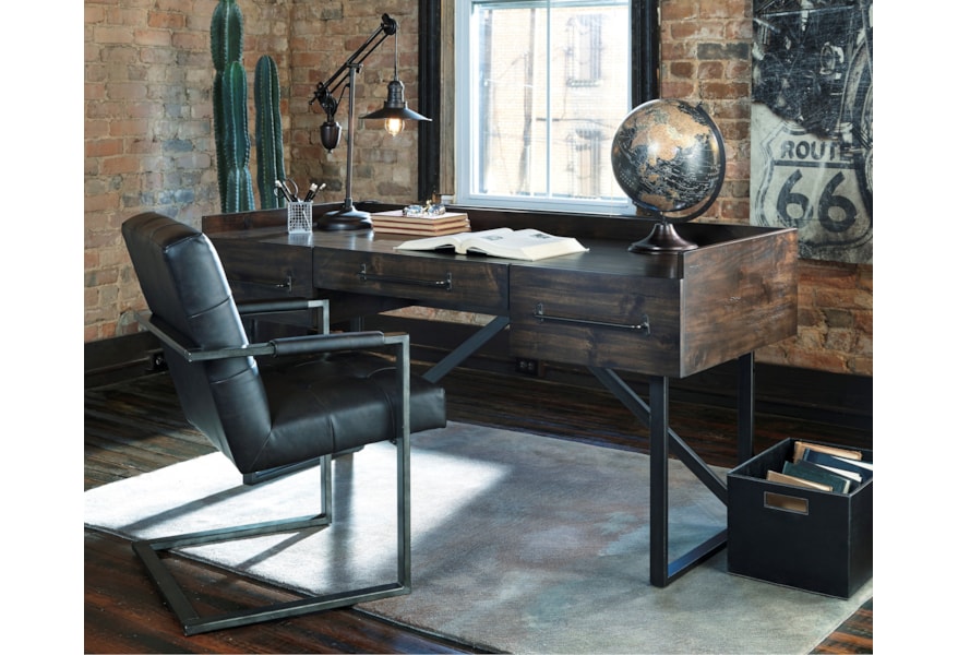 Chairs metal C-frame in a blackened gunmetal finish is sleek sculptural and ultra modern. For fans of urban industrial design the Starmore Home Office steals the show. Starmore Brown Home Office Desk Chair 2CN 2375W x 2725D x 3625H 380 lbs Starmore Brown Home Office Desk 63W x 2725D x 325H 1400 lbs Desk and shelf are made with Acacia veneer and hardwood solids rendered in an oiled walnut coloration for a deep woody finish.